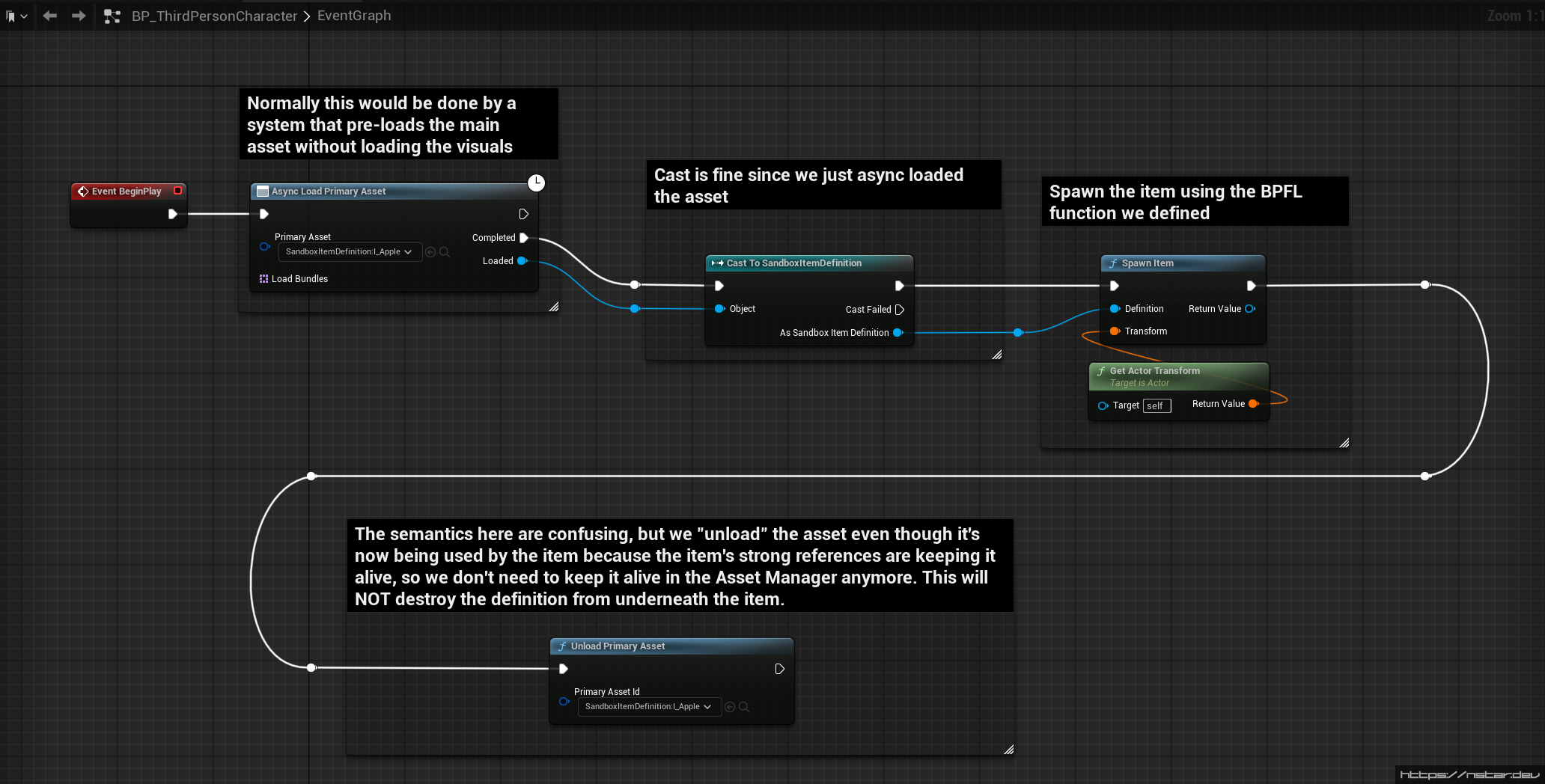UObjects in general, thus we “unload” the asset immediately after handing it to the new item actor. This will not destroy the definition or “unload” it from underneath the item actor, as the item sets up its own strong reference that will keep the Definition “alive” on its own. “Unload” is a very misleading term used by the Asset Manager API.