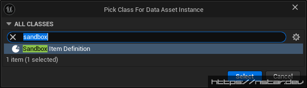 First, we’ll define the pure data that will make up our items in a UPrimaryDataAsset subclass that we’ll call USandboxItemDefinition: